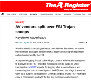 Autre question : à l’occasion de cette affaire Kaspersky, pourquoi ne reparle-t-on pas de la présence ou non de backdoors dans les antivirus américains, dont McAfee et Norton ? Qui se rappelle de Magic Lantern ? En 2001, ce ver-espion américain n’avait pas été détecté par les antivirus. À l’époque, le Washington Post (du 22 novembre) avait publié un article sur les demandes faites par le FBI aux éditeurs de logiciels de sécurité américains. Selon une dépêche d’Associated Press, Network Associates aurait assuré l’agence fédérale que le ver ne serait pas détecté par son antivirus. On peut aussi consulter l’article publié par Cryptome.