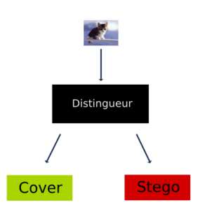 La stéganalyse est constituée de plusieurs étapes. L’idée de base est d’avoir ce qu’on appelle un distingueur. Ce dernier permet de séparer les images à tester en deux catégories, les covers, non modifiées et les stégos, modifiées. Il est simple de se représenter le distingueur comme une boite noire, il n’est pas nécessaire de comprendre son fonctionnement interne pour comprendre son rôle dans un processus de stéganalyse.