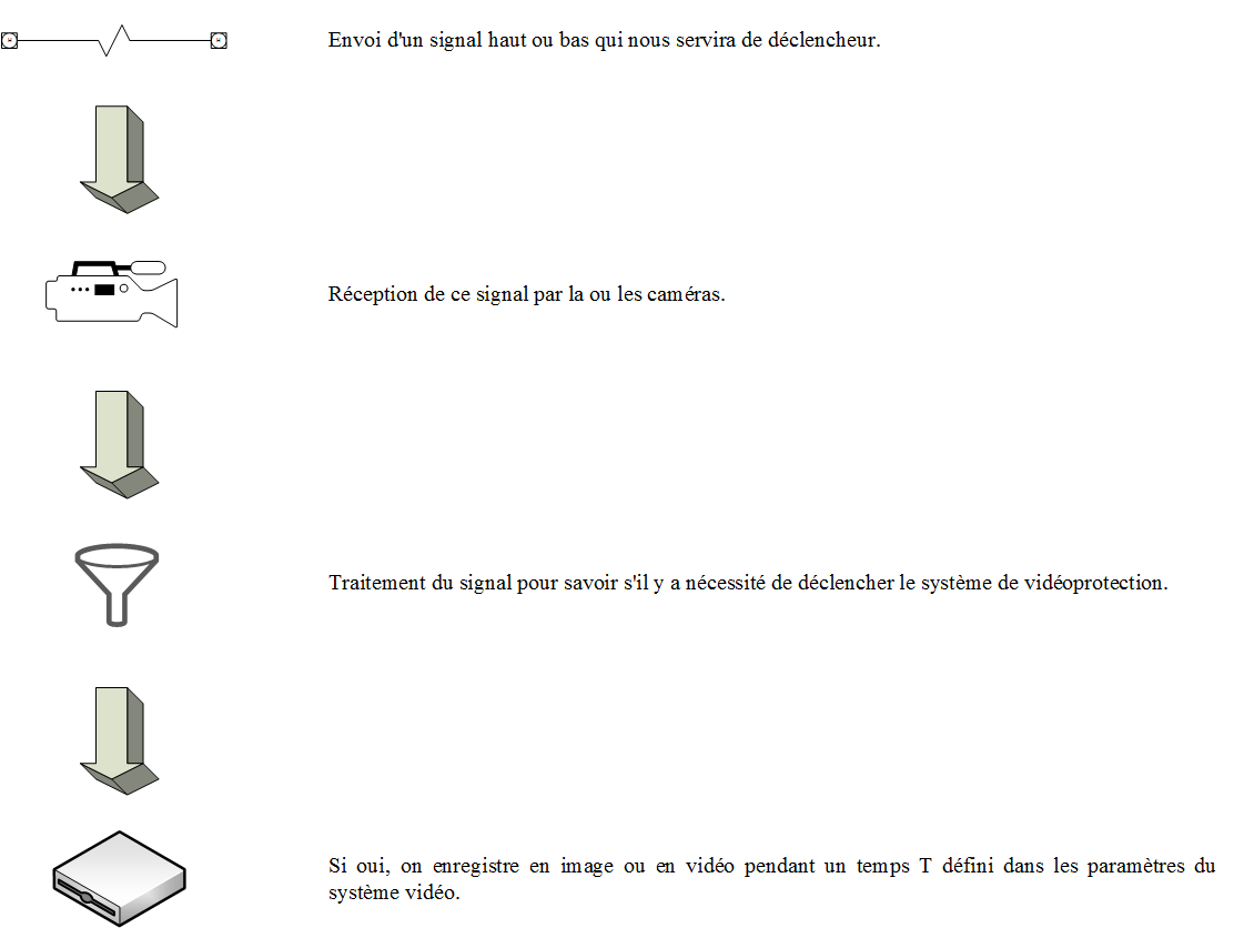 Dès qu’une intrusion est détectée, la caméra recevra le signal et enregistrera pendant un délai prédéfini (5, 15, 30 secondes). Il est à noter que certaines caméras possèdent une mémoire vidéo interne de quelques minutes. Lors du déclenchement, il est possible de récupérer le contenu de cette mémoire et ainsi stocker les images enregistrées juste avant l’événement. L’utilité de cette technique se révèle d’autant plus pertinente lors d’une enquête. En effet, les enregistrements coïncident exactement à la chronologie de l’infraction (ex : serrure forcée, puis entrée d’un individu dans la zone sous surveillance). Avec ce dispositif, la caméra « voit » en permanence, et ne lance la sauvegarde externe qu’après en avoir reçu l’ordre.